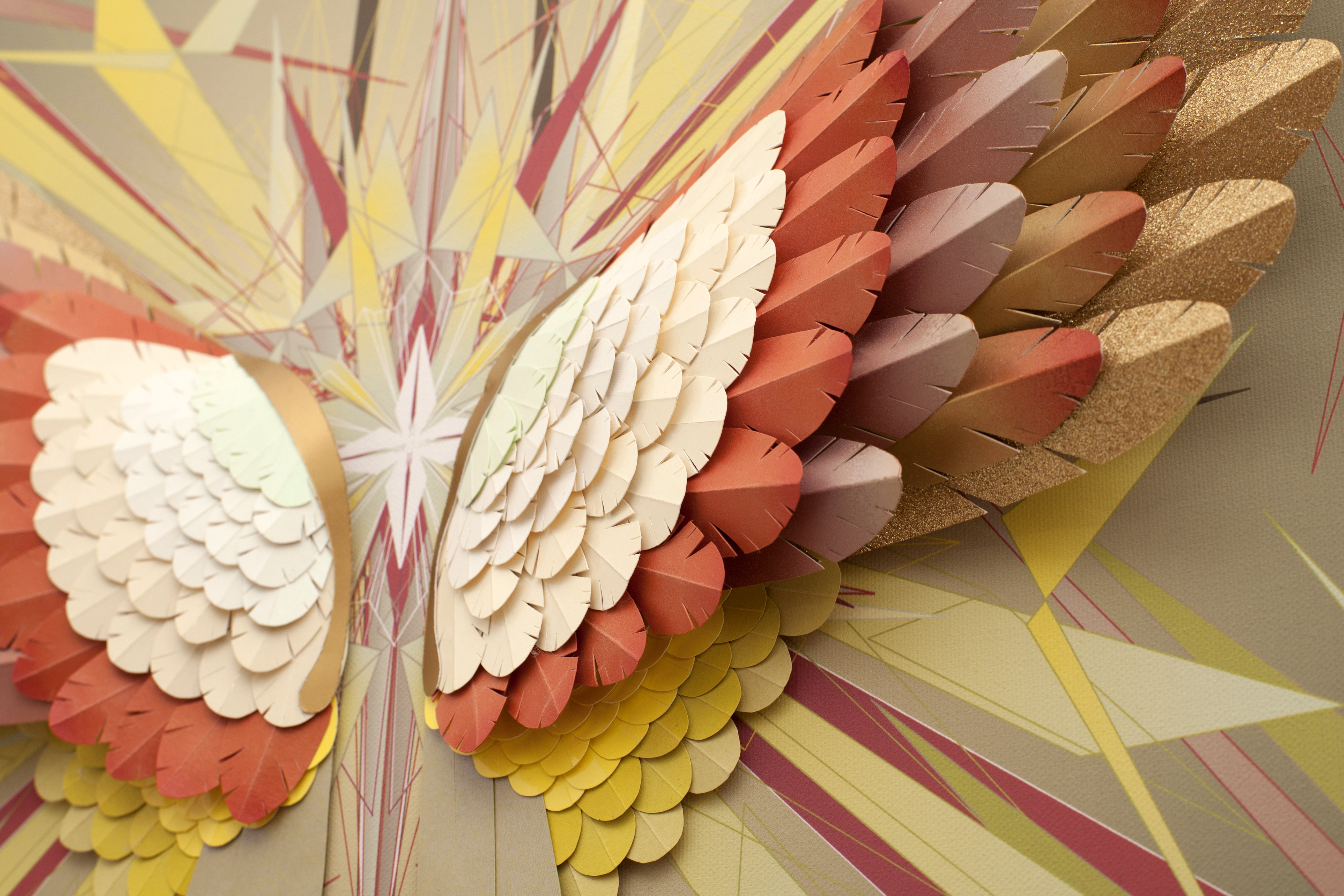 Three-dimensional wings assembled on a technical light explosion mural. A colorful burst of gradients, this is the second series of a collection that represents an epiphany of peace. The seven color ways display a variation of emotions & experiences when taking life's journey. A four-pointed star is the in the center is our humanity, wings are freedom & light rays, the premise that expose all colors and structure in the true, natural form of life cycles. It is related to the Exploding Florals series as it is distinctive that in death we are not different from the plants and flowers that also come to pass.