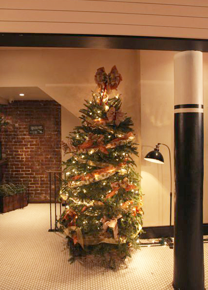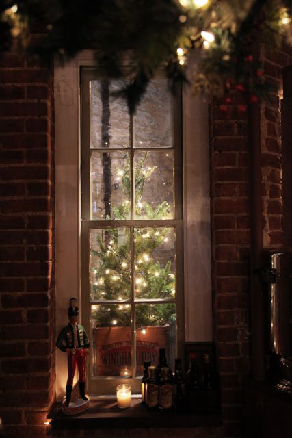 Garlands, wreaths, evergreens, silk bows & foiled gold decked the halls and booths. Fresh pine, holly & spearmint complimented the hot steaming cider with a cinnamon stick served daily during the season. Then a combination of miniatures made from holiday relics, folded paper & tiny trees that lit up in a few bell jars... a holiday setting made to take one back to ye olde cozy comforts of the traditional season.