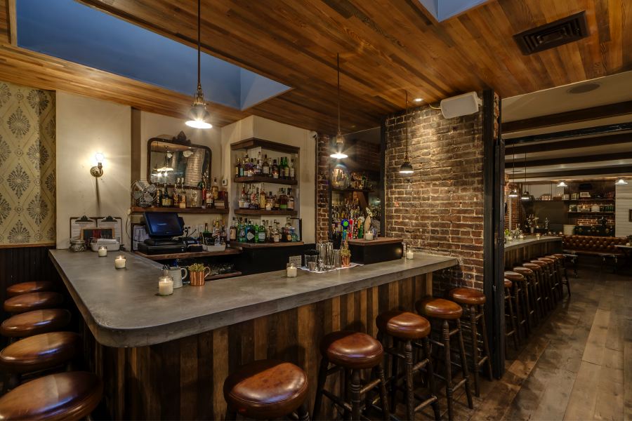 reminiscent of the early century post industrial revolution. Haunting vintage portraits, old machinery, weathered wood furniture, gold leaf, tiny white tiles, aged leather & course toile print fabrics, tarnished brass, delicate glass, hand-painted signs, hints of cotton plant, wheat & lavender stock the bar is like sitting within a decorated set itself.
